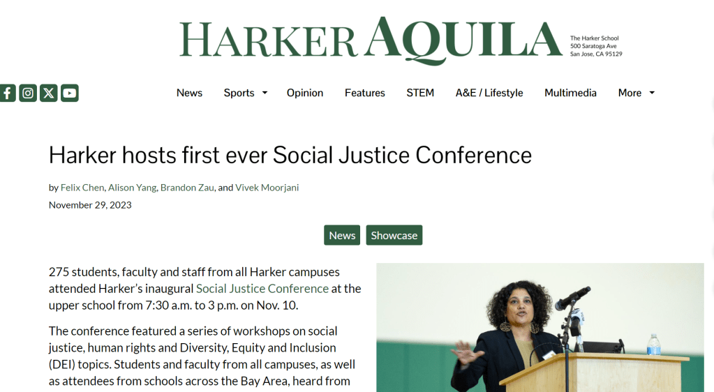 Harker hosts first ever Social Justice Conference. Harker Aquila. November 29, 2023.